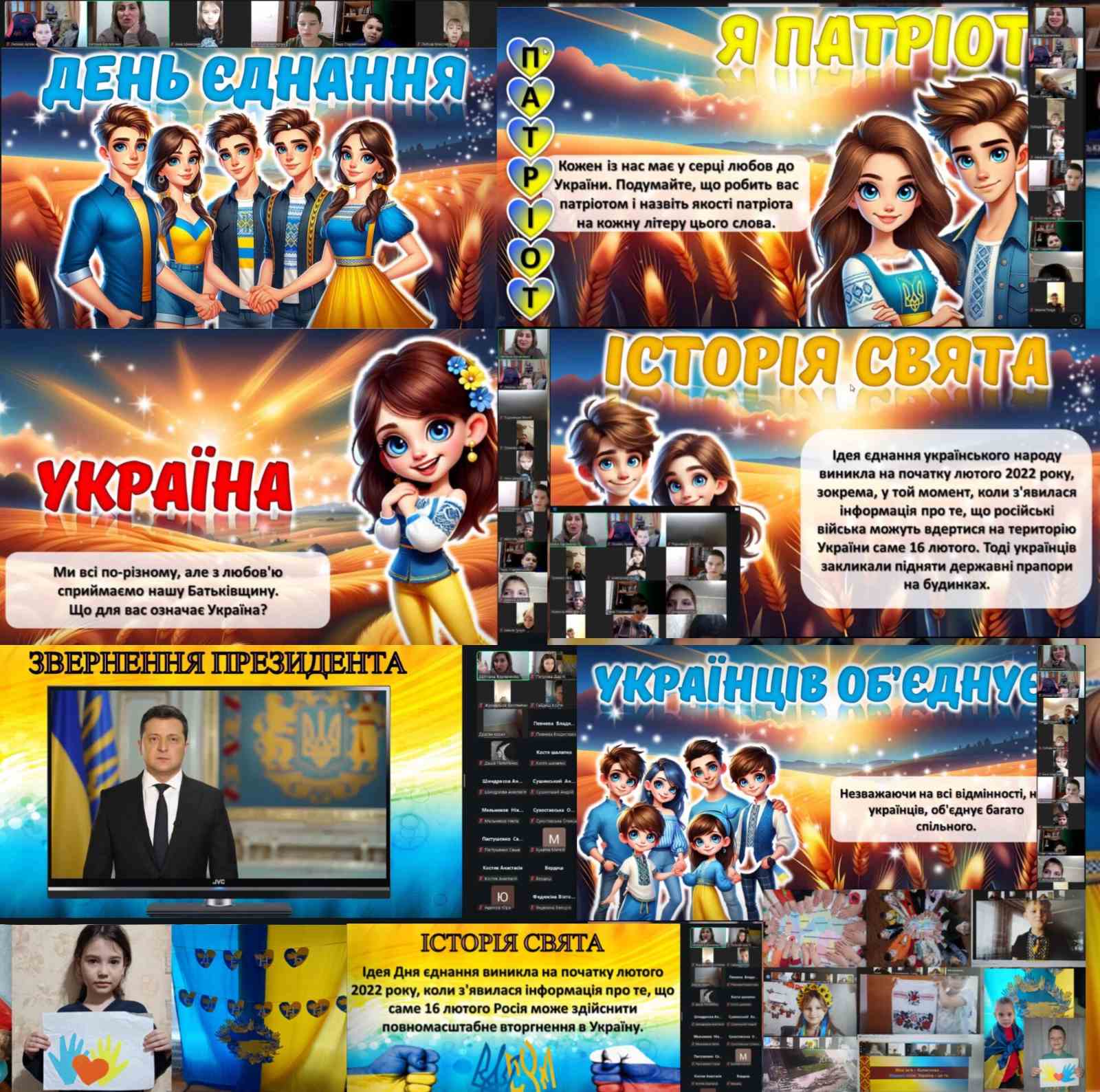 В гімназії відбулися тематичні заходи, спрямовані на виховання почуття єдності, патріотизму та любові до рідної країни.У закладі були проведені виховні години, конкурси малюнків, під час яких діти через творчість висловлювали своє бачення єдиної України. Особливо зворушливими стали заходи «Коло єднання» та єднання біля Державного Прапора України, які символізували згуртованість, дружбу та спільну віру в мирне майбутнє нашої держави.Такі події формують у дітей усвідомлення того, що в єдності — сила українського народу.