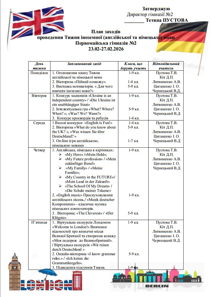 Учителями іноземних мов були організовані різноманітні заходи в дистанційному та очному форматах. Заходи тематичного тижня охопили учнів усіх вікових категорій. Понеділок розпочався з виставки мотиваторів «Для чого вивчати іноземні мови». Учні середніх та молодших класів приєдналися до виставки, створюючи малюнки з написами, чому саме вони вивчають мови. Учні 7,8,9 класів взяли участь в анкетуванні «Для чого я вивчаю іноземні мови?». Також у цей день учні молодших класів взяли участь у вікторині «Піймай помилку», розвивали свою увагу та спритність у пошуках помилок.У вівторок до роковини повномасштабного вторгнення учні 1-9 класів брали участь у конкурсі малюнків «Україна – незалежна країна». В 7а класі вчитель Литвиненко А.В. провів інтелектуальну гру «Що? Де? Коли?», під час якої учні продемонстрували свої інтелектуальні здібності та вміння працювати в групах. У 7-б і 9-б класах учитель Кіт Д.П. провів вікторину «Цікаві факти про Німеччину». Також в цей день учні початкових класів показали свої здібності в розв’язуванні ребусів та кросвордів англійською мовою.В середу учні гімназії переконалися, що вивчати мови це не тільки корисно, а ще й цікаво. Молодші класи брали участь в конкурсах «Англійська це весело», в той час як учні середніх класів провели весело час граючи в онлайн ігри на іноземних мовах. Учитель Кіт Д.П. у 8-а класі знайомив учнів з казками німецьких письменників братів Грімм. Вчителька Циганенко І.О. в цей день провела в 7-б класі челендж «Англійська навколо нас» та в четвер вікторину «Чи знаєте ви англійську» , під час яких учні проявили творчість, ініціативність та зацікавленість, що сприяло удосконаленню мовленнєвих навичок та формуванню позитивної мотивації до навчання. Також у четвер учні різних класів прослуховували пісні іноземними мовами, ознайомилися з класичними творами німецьких композиторів Моцарта, Бетховена, Мендельсона, Штрауса, взяли участь в фотовиставці «Англійська та німецька в картинках», малювали картинки на тему «Мій герой», «Моя країна в майбутньому». Учні 9-б класу в цей день взяли участь у вікторині «Найрозумніший», визначивши для себе, наскільки вони володіють інформацією про свою країну та англомовні країни світу.В останній день тижня учні гімназії здійснили віртуальну подорож по Британії та Німеччині за допомогою Гугл карти, що дало їм можливість в режимі реального часу побувати у визначних місцях цих країн. Школярам було запропоновано приготувати фотоколаж та розповідь про одне з визначних місць, на що учні відкликнулися з зацікавленістю. У цей день вчителі іноземних мов вкотре приділили увагу граматиці, провівши в 5-9 класах вікторину «Я знаю граматичні правила». Учні гімназії добре знають, що знання граматики допоможе їм розуміти та спілкуватися мовами правильно.