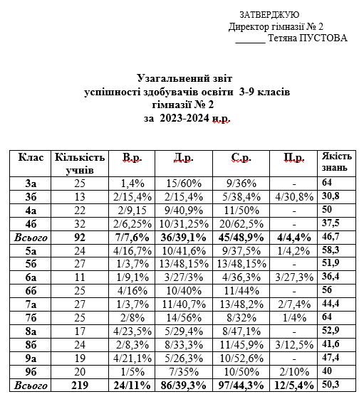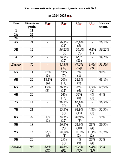 Узагальнений звіт успішності учнів гімназії № 2 за 2024-2025 н.р.