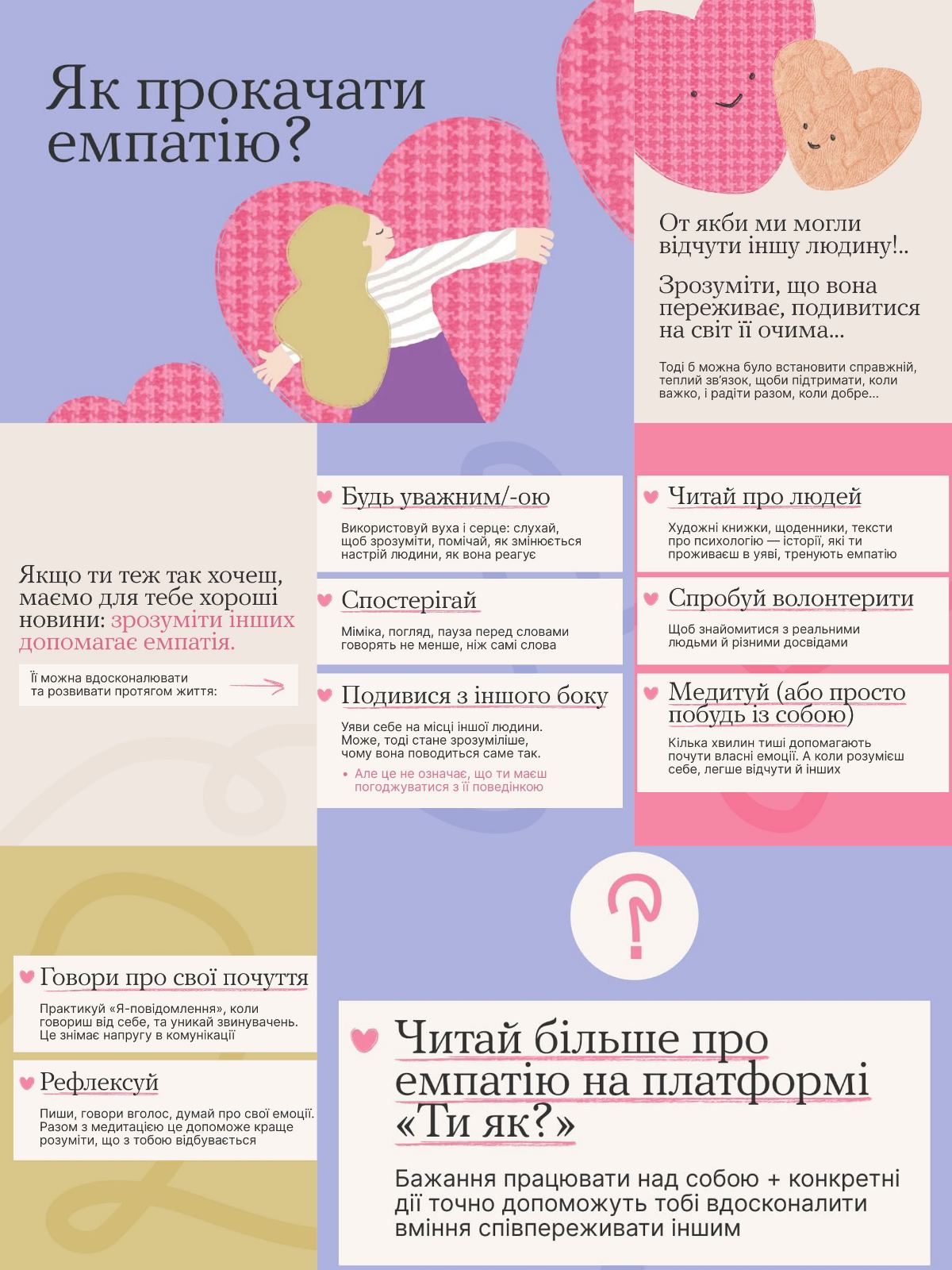 Вона потрібна нам усім, щоб розуміти, співпереживати та підтримувати одне одного. Про це навіть діти у школі знають: до Дня ментального здоров’я для українських учнів проводилися уроки емпатії за підтримки Міністерство освіти і науки України разом із ПЛЮСПЛЮС та 1+1. А тренінги проходили і студенти-першокурсники спільноти університетів «Ти як?» по усій країні. Дещо з уроків емпатії можеш навчитися і ти: ідеї, як прокачувати її, є в каруселі 👉 Гортай і дай знати, якщо тобі корисно ❤️