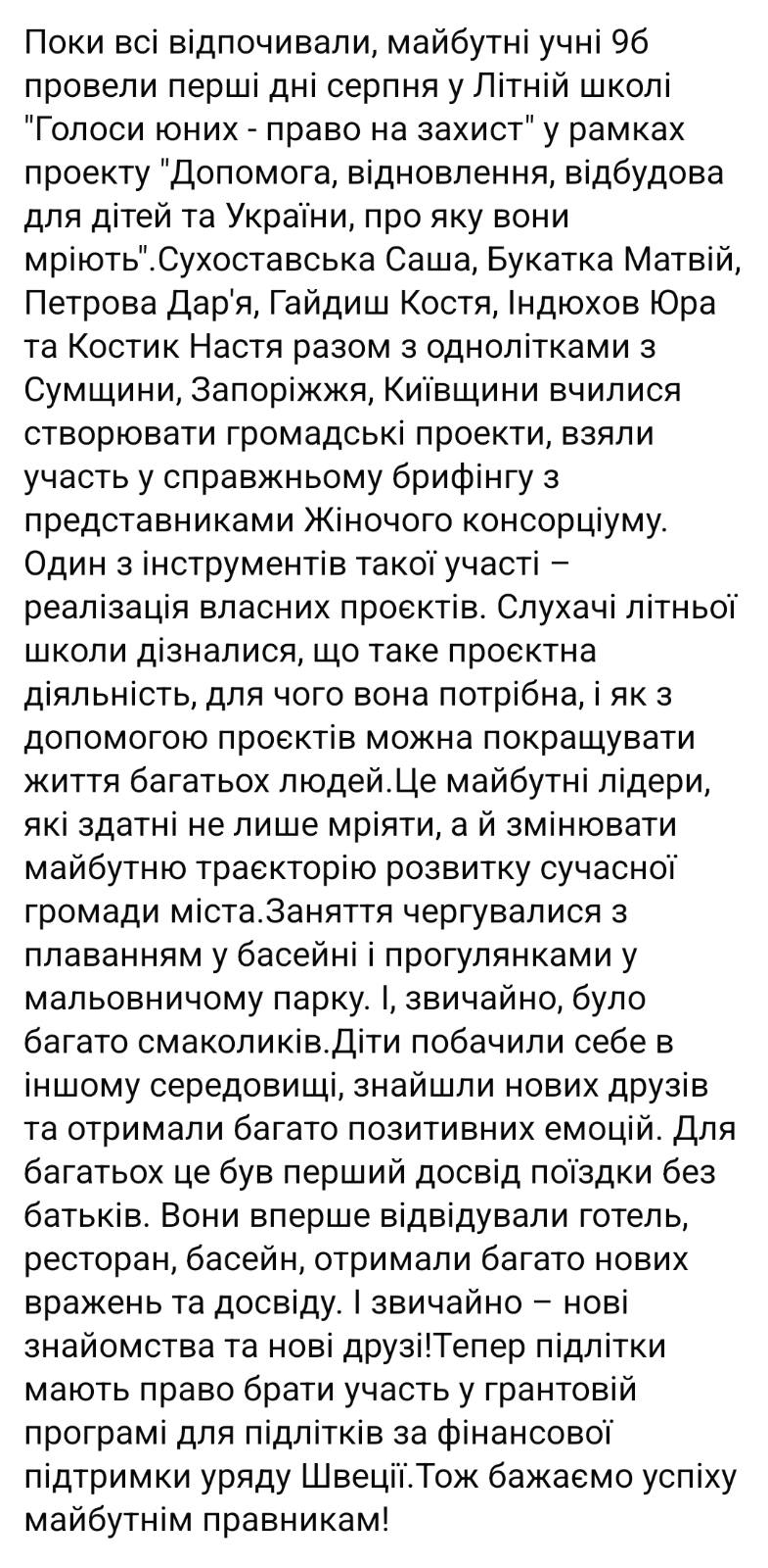 На жаль, четвертий навчальний рік ми починаємо під час війни. Дякуємо нашим захисникам і захисницям за можливість навчатися, працювати, жити в нашій рідній Україні! Впевнена, що ми і надалі будемо підтримувати тих, хто нас захищає.