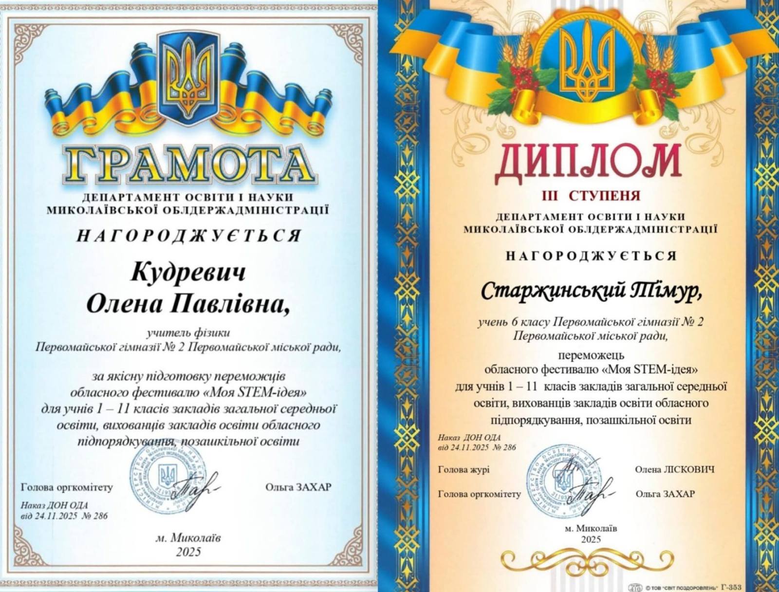 Вітаємо Кудревич Олену Павлівну та ученя 6 класу Старжинського Тимура, за отримання високої відзнаки на обласному фестивалі «Моя STEM-ідея». Вчитель Кудревич Олена Павлівна була відзначена почесною грамотою Департаменту освіти і науки Миколаївської ОДА за якісну підготовку переможця конкурсу. Тимур здобув Диплом ІІІ ступеня, продемонструвавши цікаву STEM-ідею, наполегливість та щире бажання пізнавати світ науки.