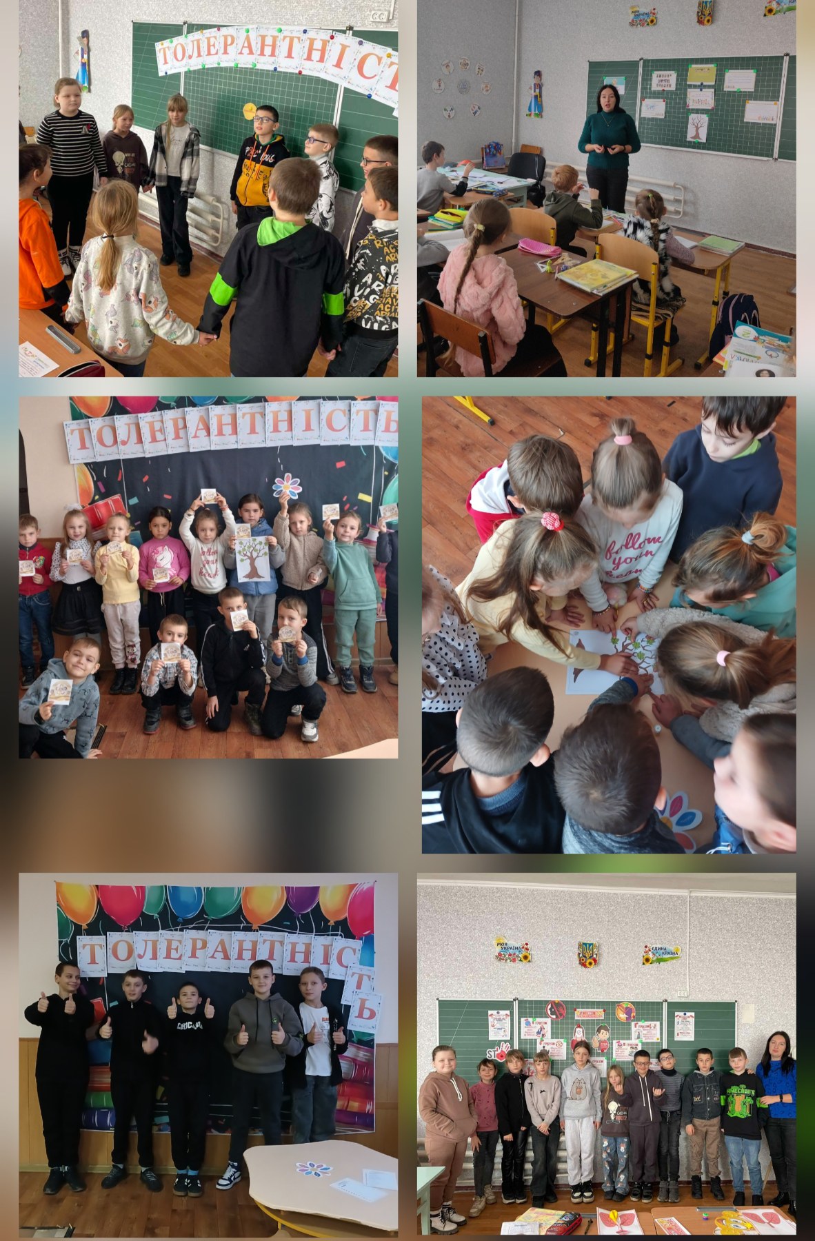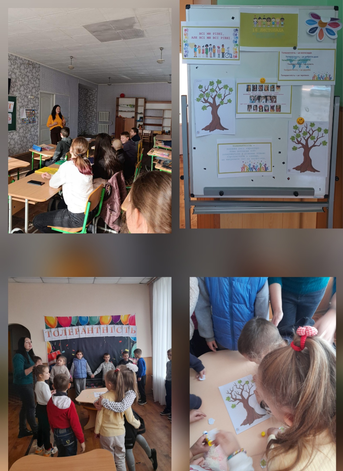 Діти початкової школи робили квітку толерантності, розігрували різні ситуації з життя, за що отримали медаль “Толерантність починається з мене” та робили аплікацію “Дерево добрих слів”.