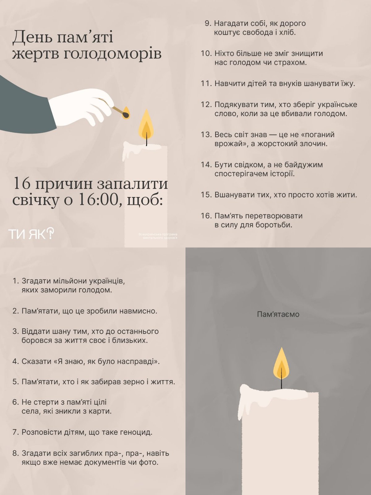 Не страшно, якщо не знайдеться свічки, чи можливості її запалити о 16:00. Страшно, коли не стане пам’яті про тих, кого заморили голодом. Пам’ятай