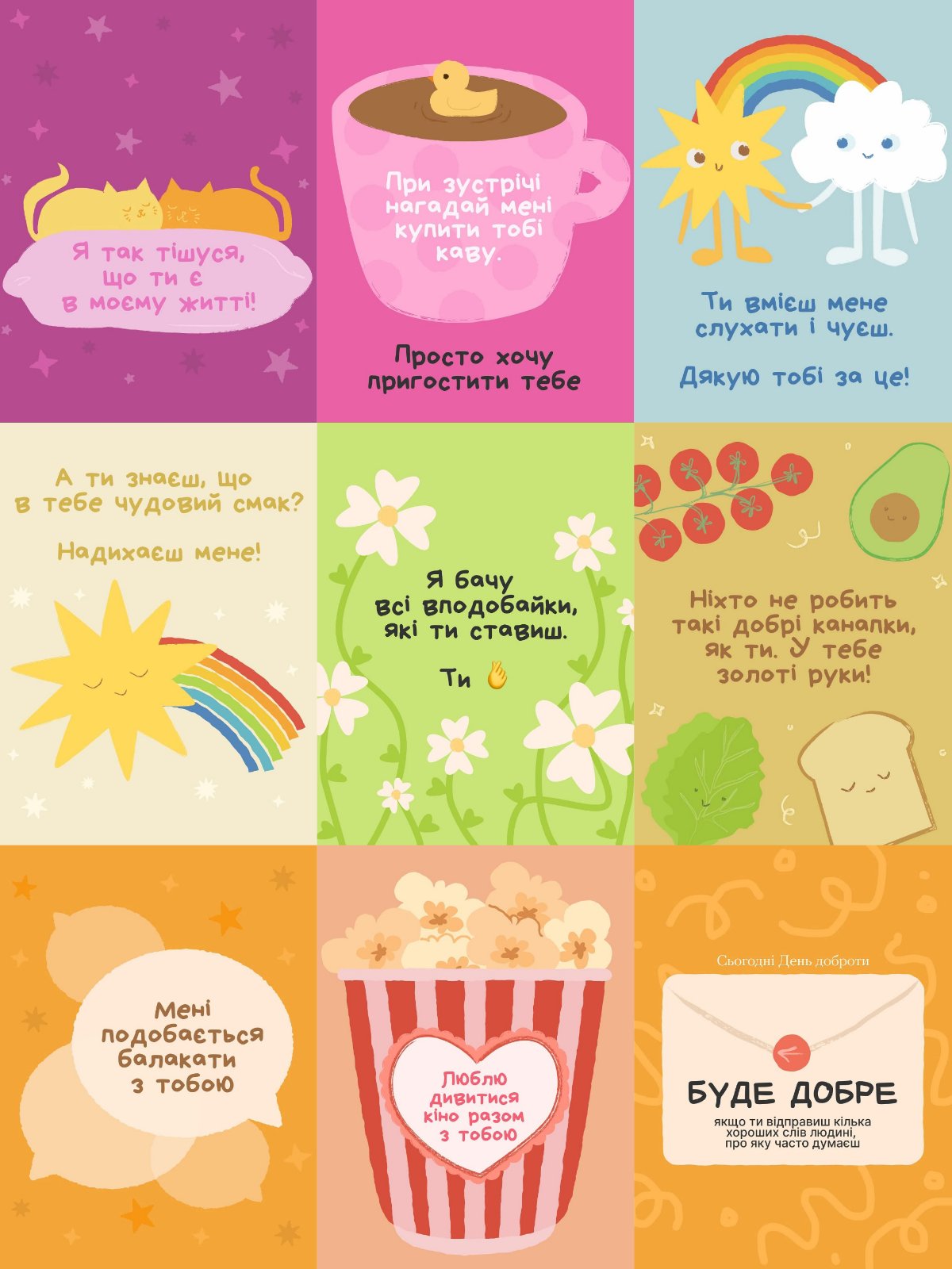 Добрий день, бо сьогодні — День доброти ✏️ Отже, можна зробити +1 добру справу. Наприклад, сказати важливій людині щось хороше. І в каруселі навіть є ідеї, що саме. Обирай і надсилай. Буде добре 😌