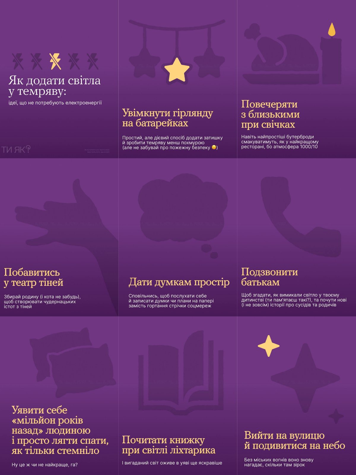 А що як вечір без світла — це не тільки про незручності та темряву, а й можливість сповільнитися та провести більше часу з собою та близькими? У каруселі знайдеш ідеї, як зробити цю темряву трохи світлішою. А тепер розкажи в коментарях, а що підтримує тебе під час відключень? ![]()